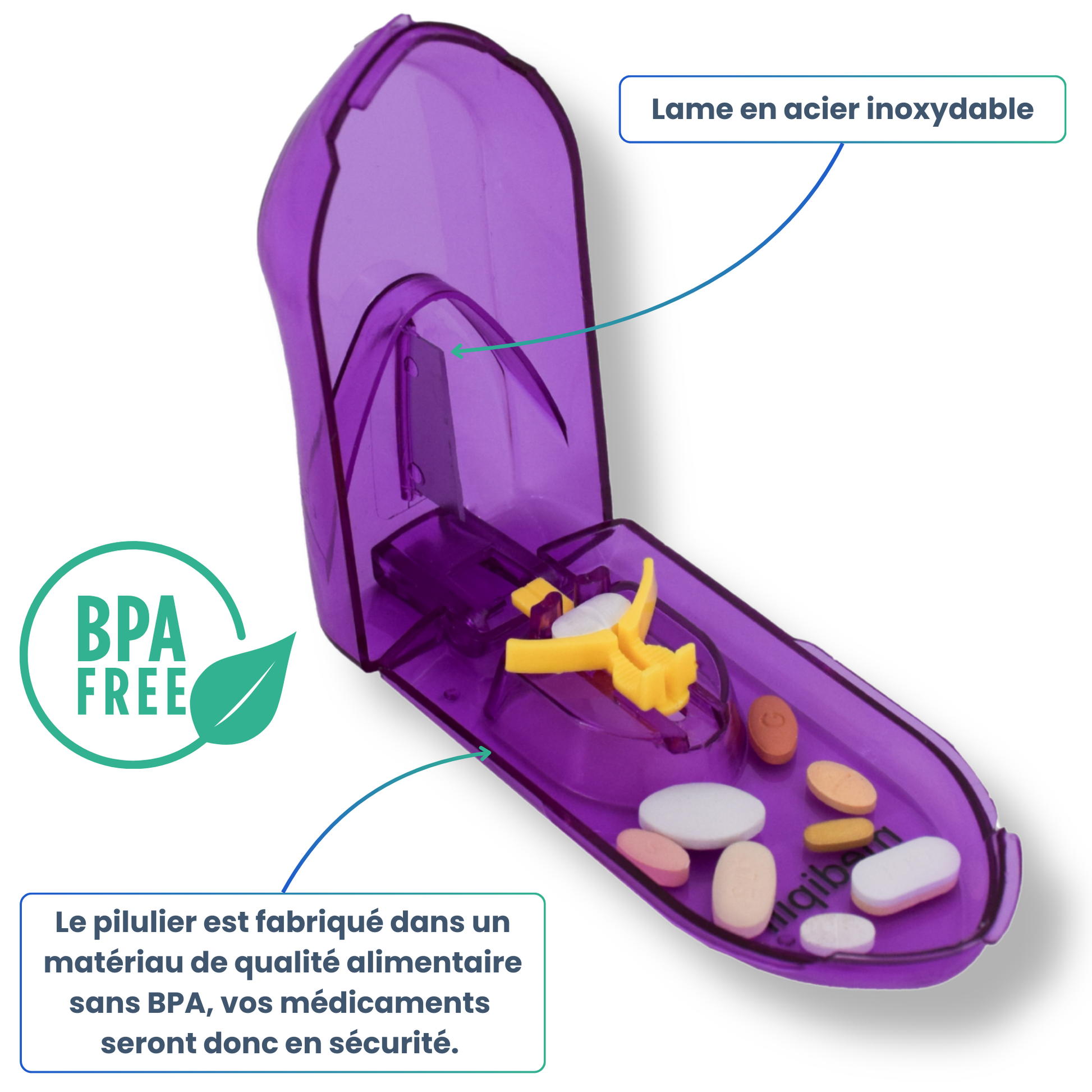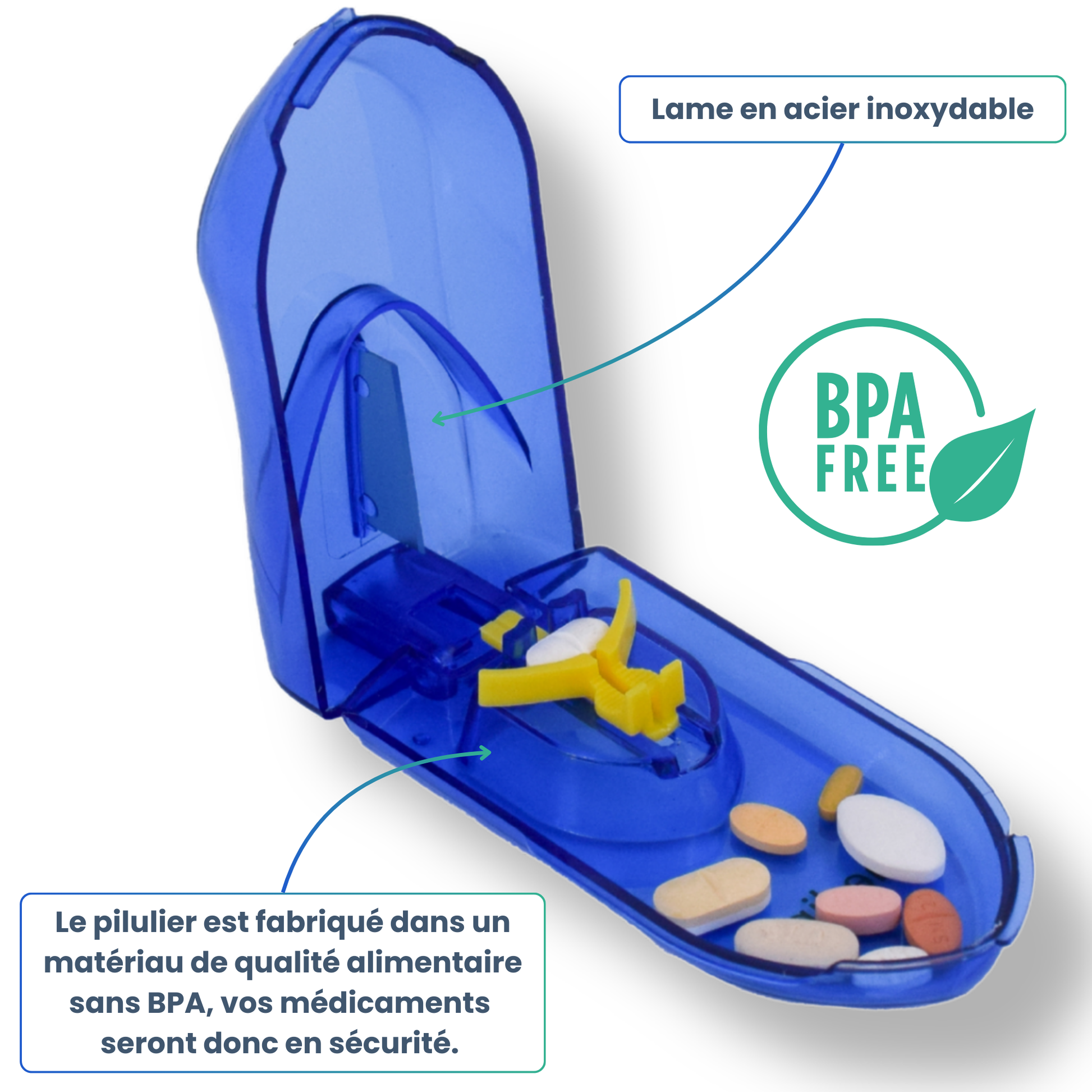 - 🛡️ DÉCOUPEZ AVEC SÉCURITÉ : Fabriqué en plastique sans PBA, notre coupe-comprimés est équipé d'une lame tranchante en acier inoxydable. Vous pouvez couper vos pilules sans risque de contamination ni de blessure. Utilisez cet outil en toute tranquillité grâce à sa conception robuste et fiable.