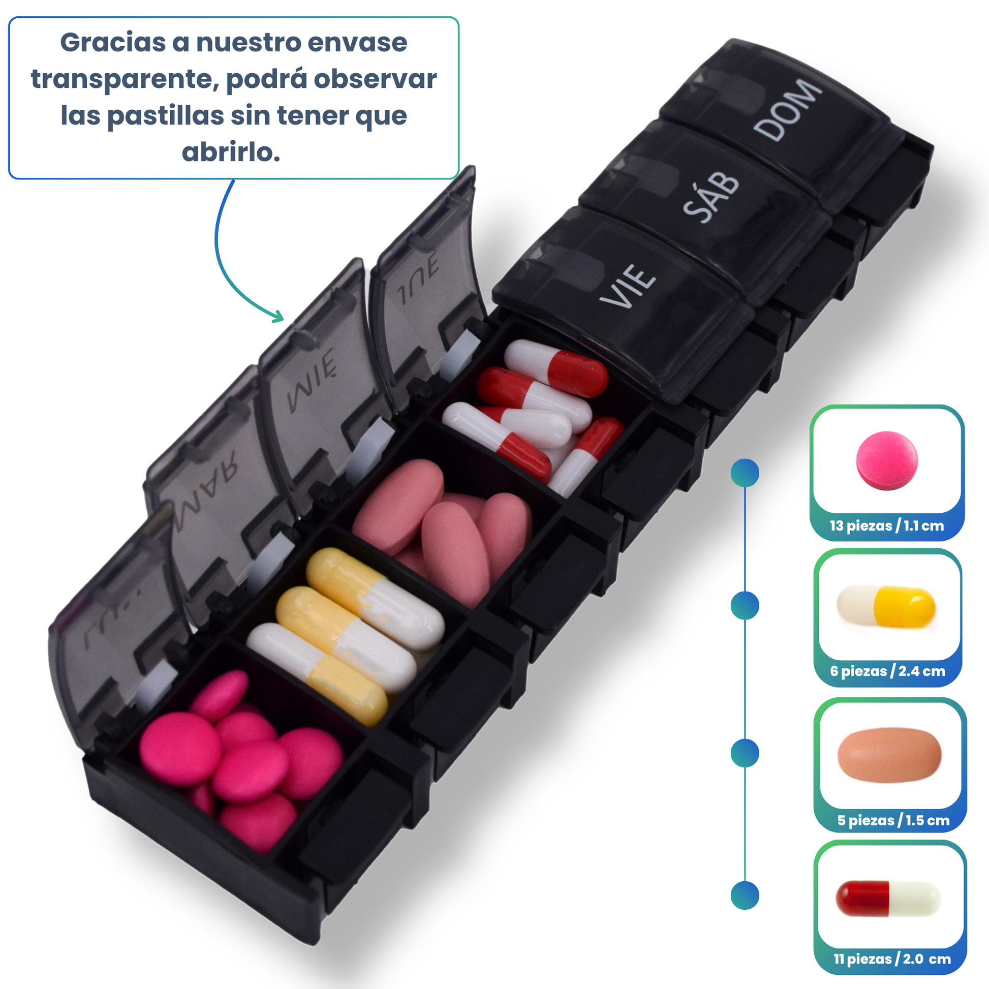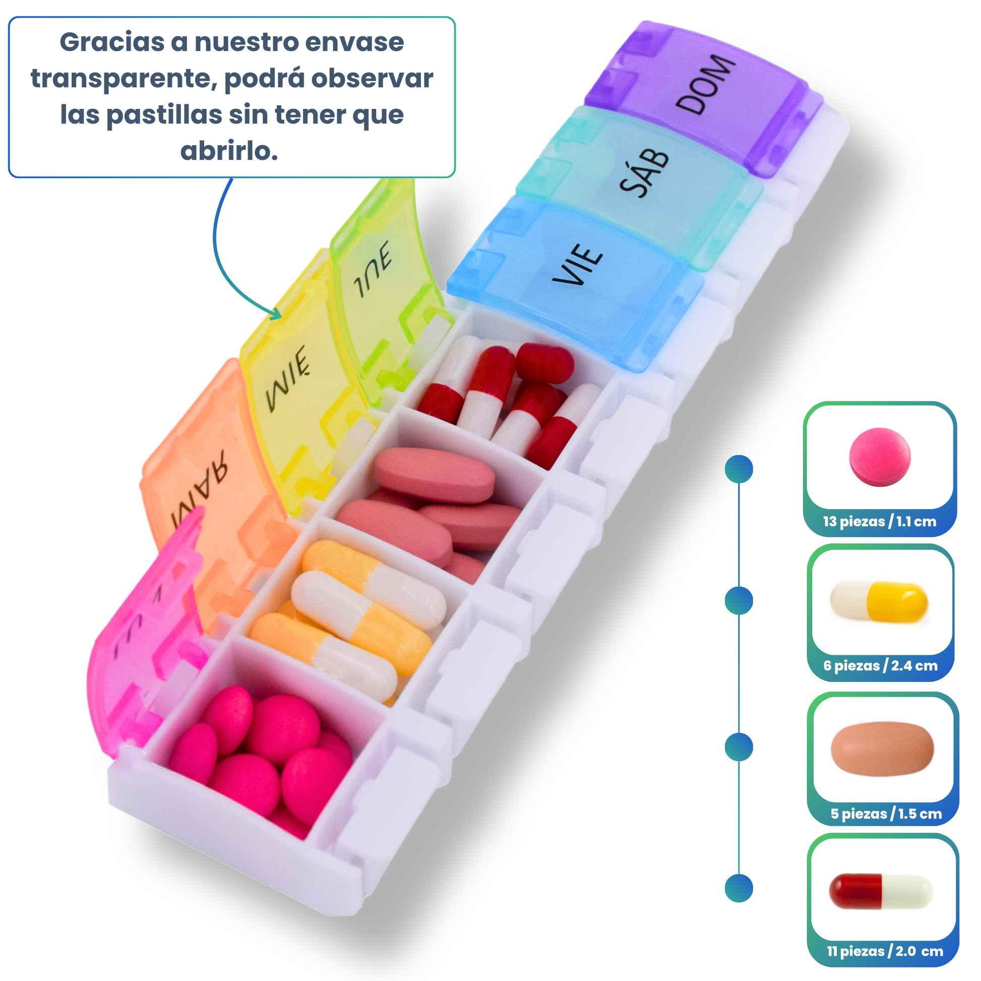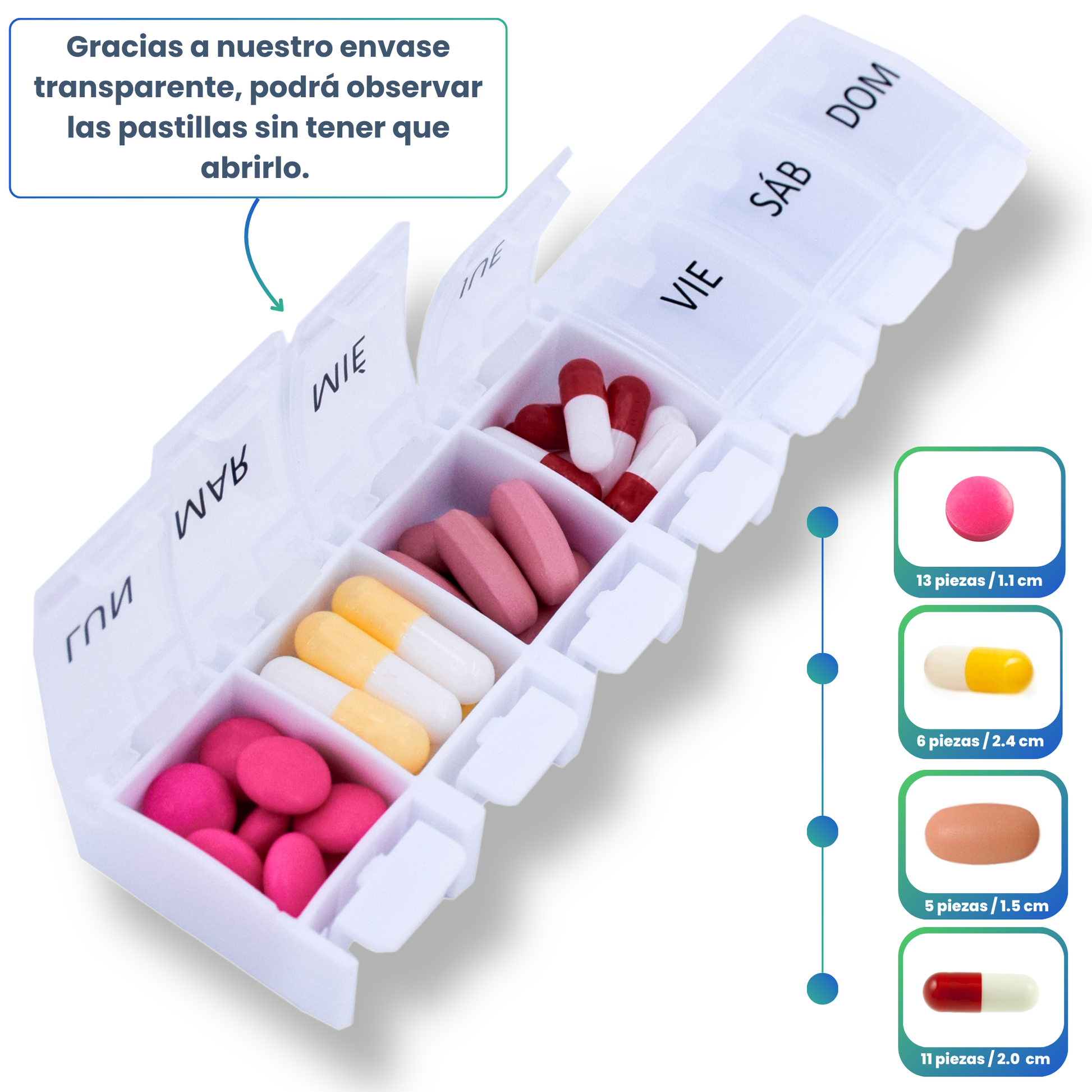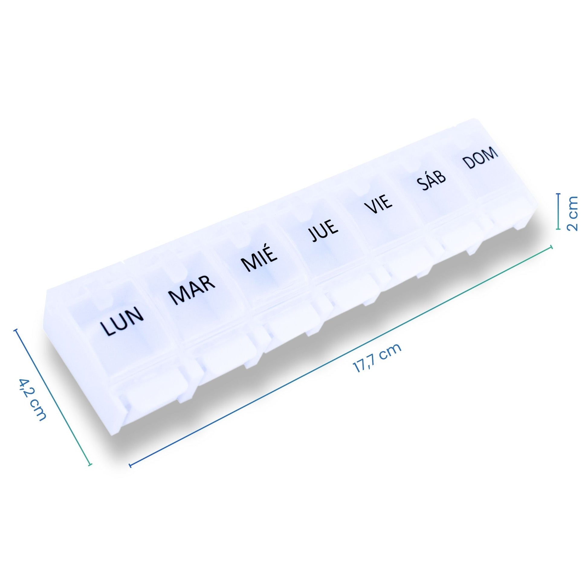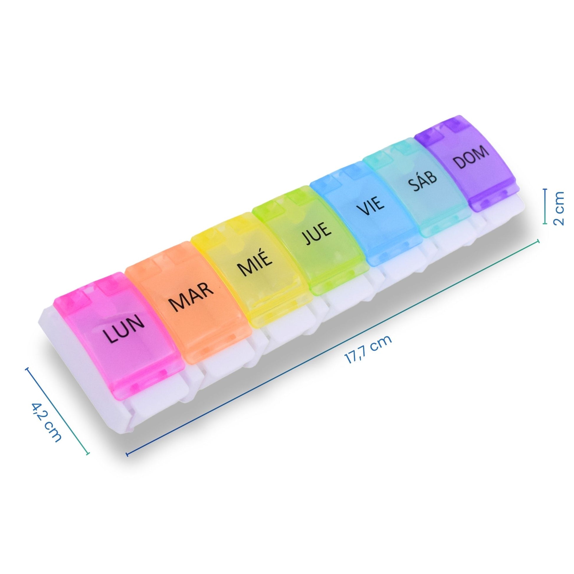 - đïž ORGANISATION HEBDOMADAIRE : Pilulier semainier avec 7 compartiments individuels, un pour chaque jour de la semaine. IdĂ©al pour planifier vos mĂ©dicaments sur une semaine complĂšte.