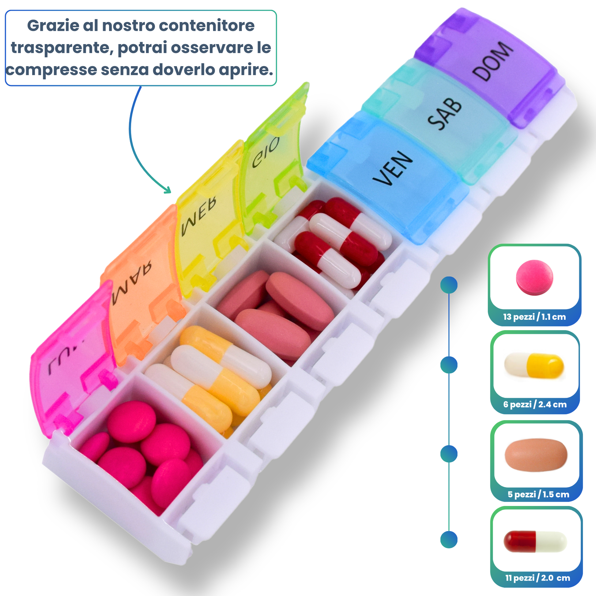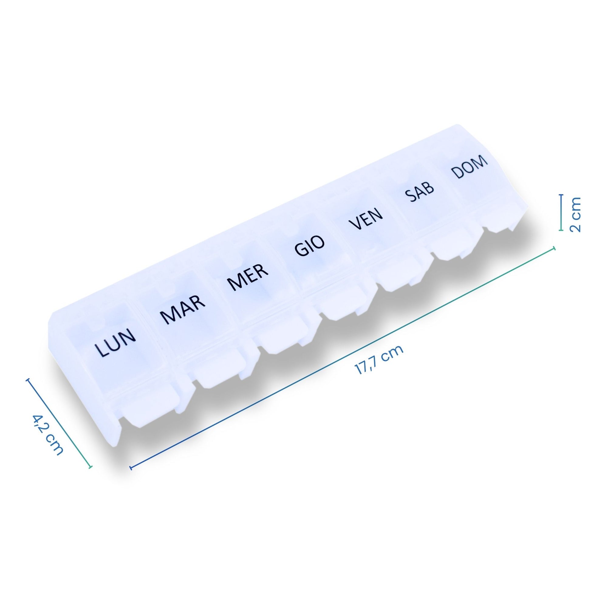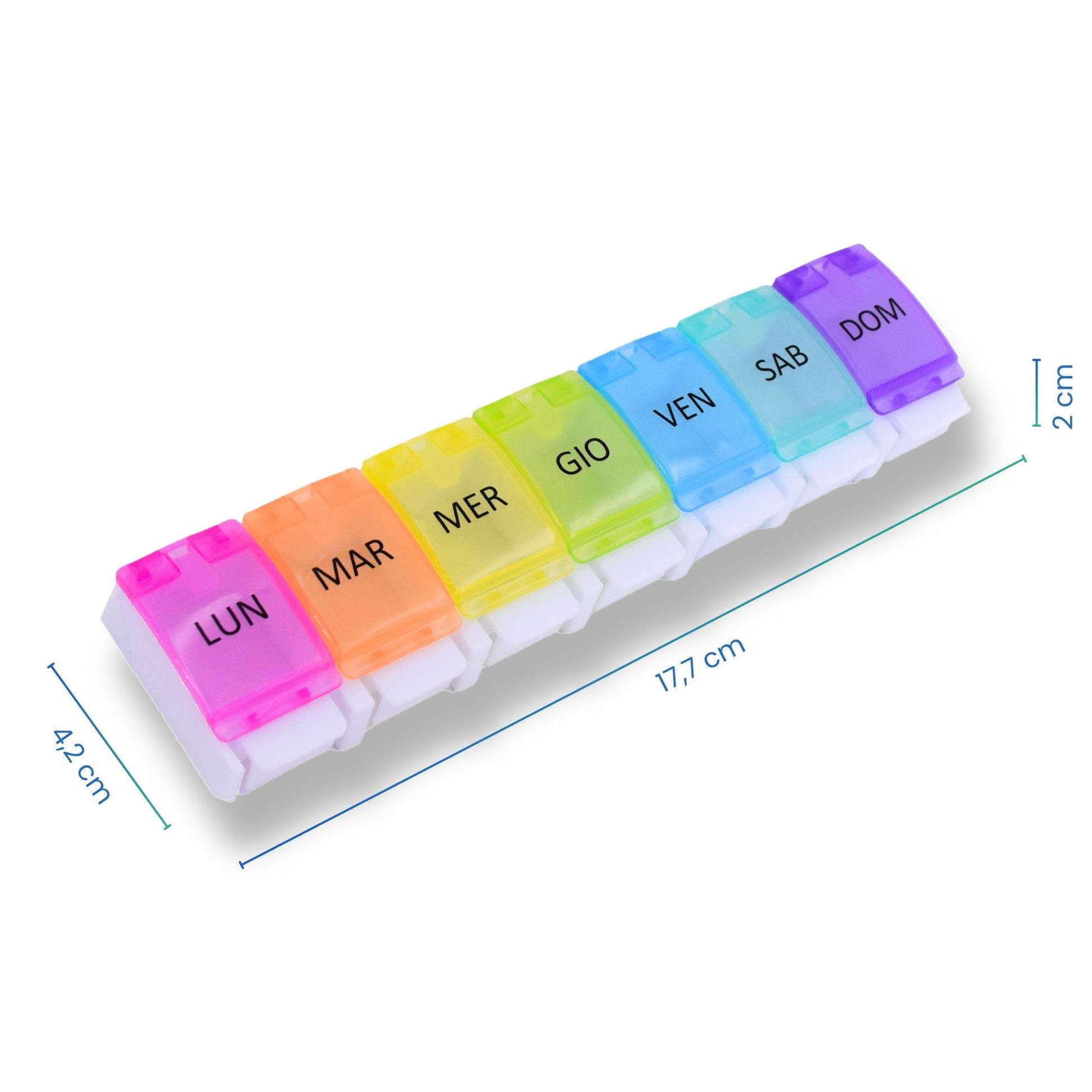 - đïž ORGANISATION HEBDOMADAIRE : Pilulier semainier avec 7 compartiments individuels, un pour chaque jour de la semaine. IdĂ©al pour planifier vos mĂ©dicaments sur une semaine complĂšte.