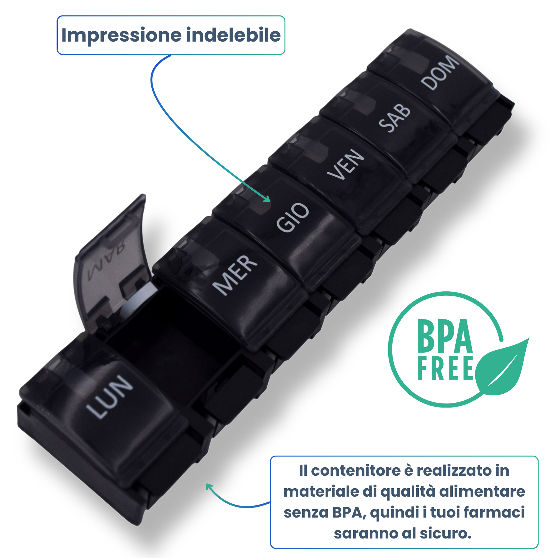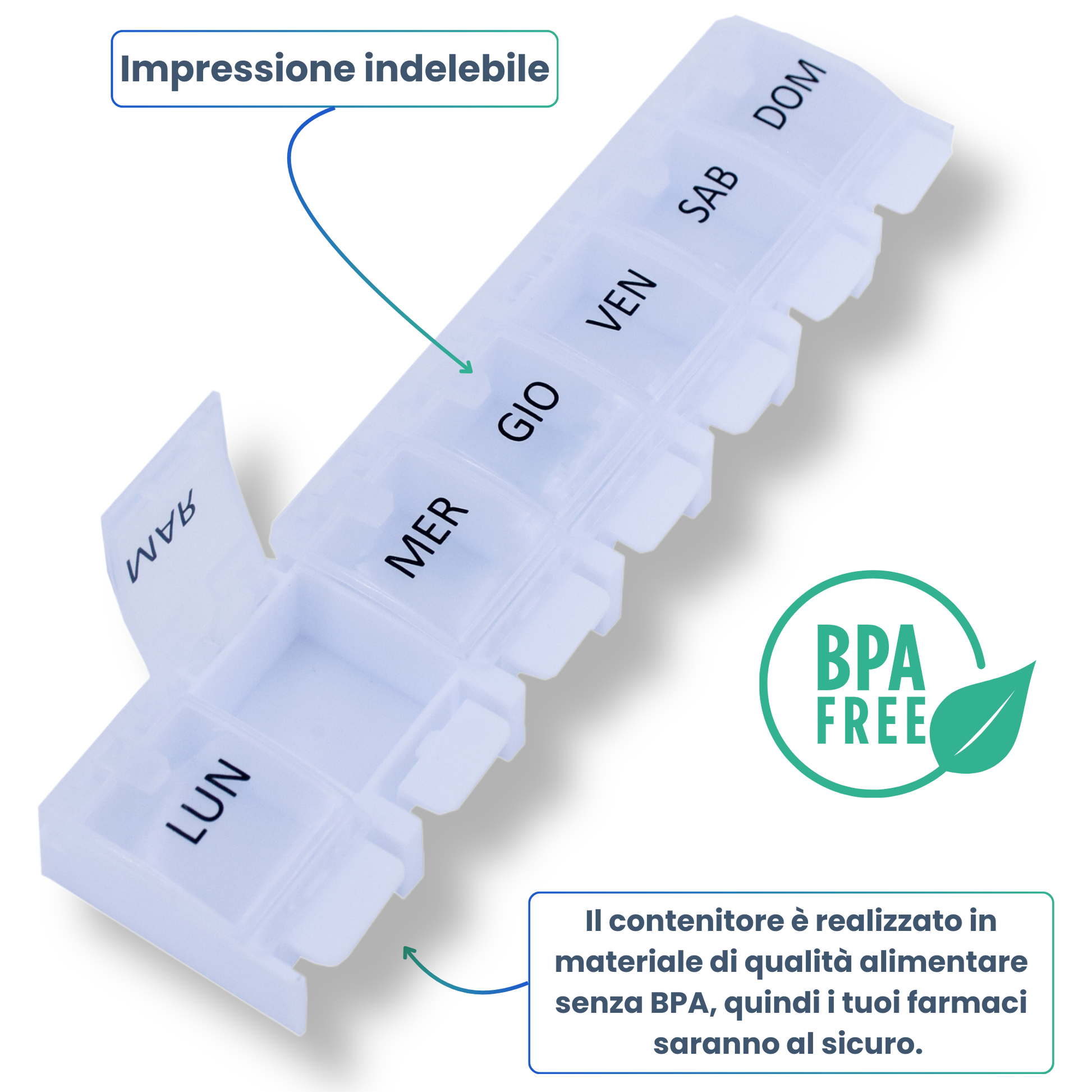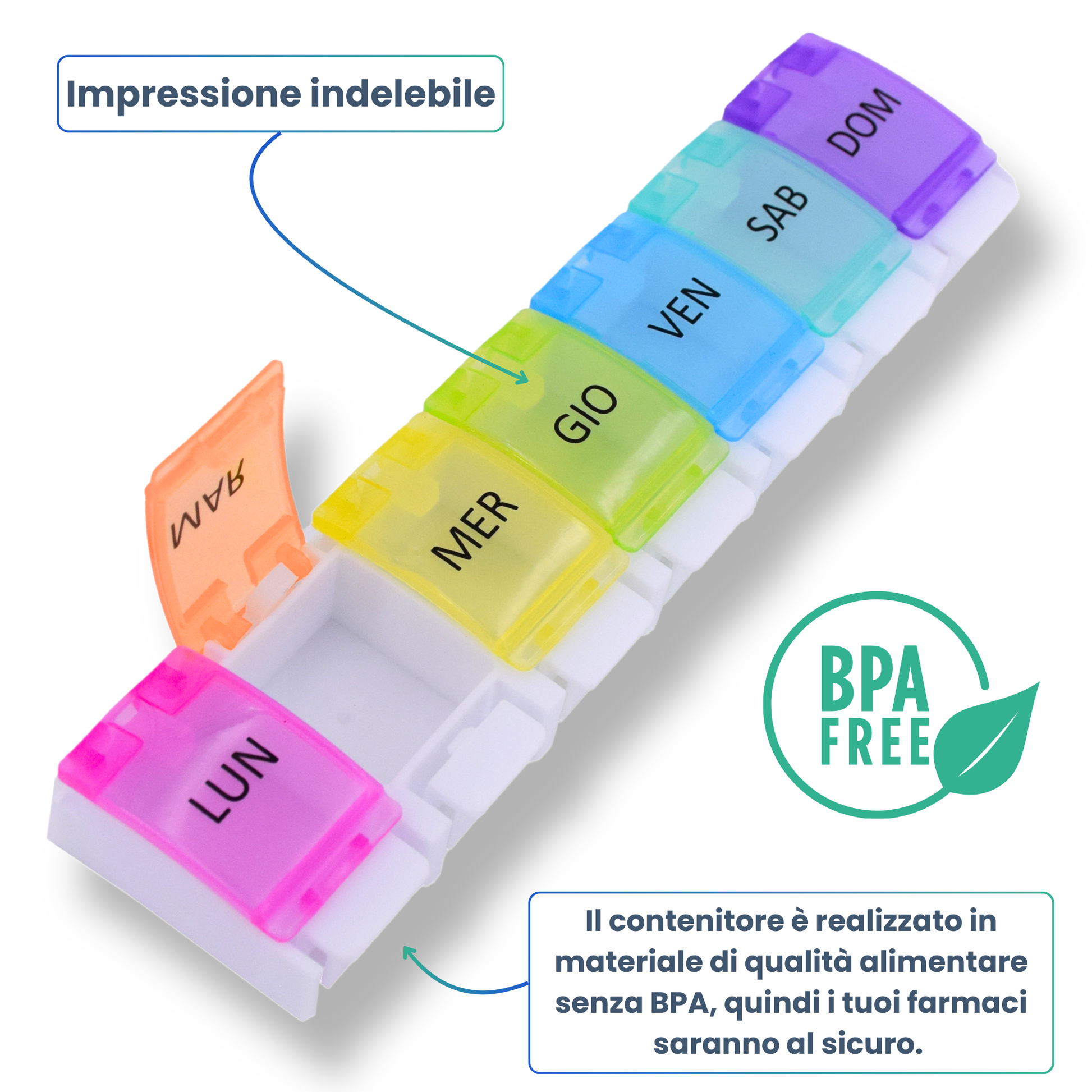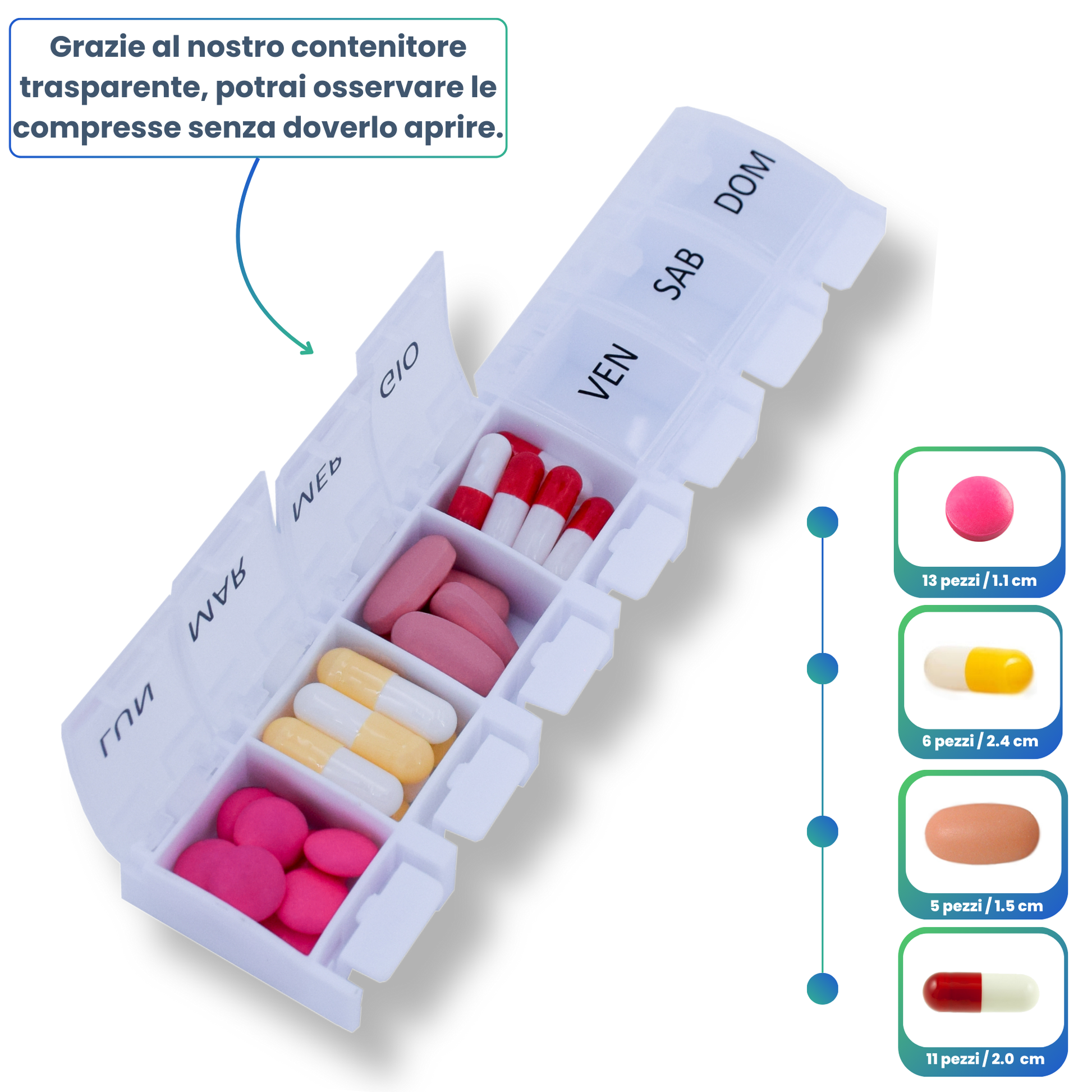 - đïž ORGANISATION HEBDOMADAIRE : Pilulier semainier avec 7 compartiments individuels, un pour chaque jour de la semaine. IdĂ©al pour planifier vos mĂ©dicaments sur une semaine complĂšte.