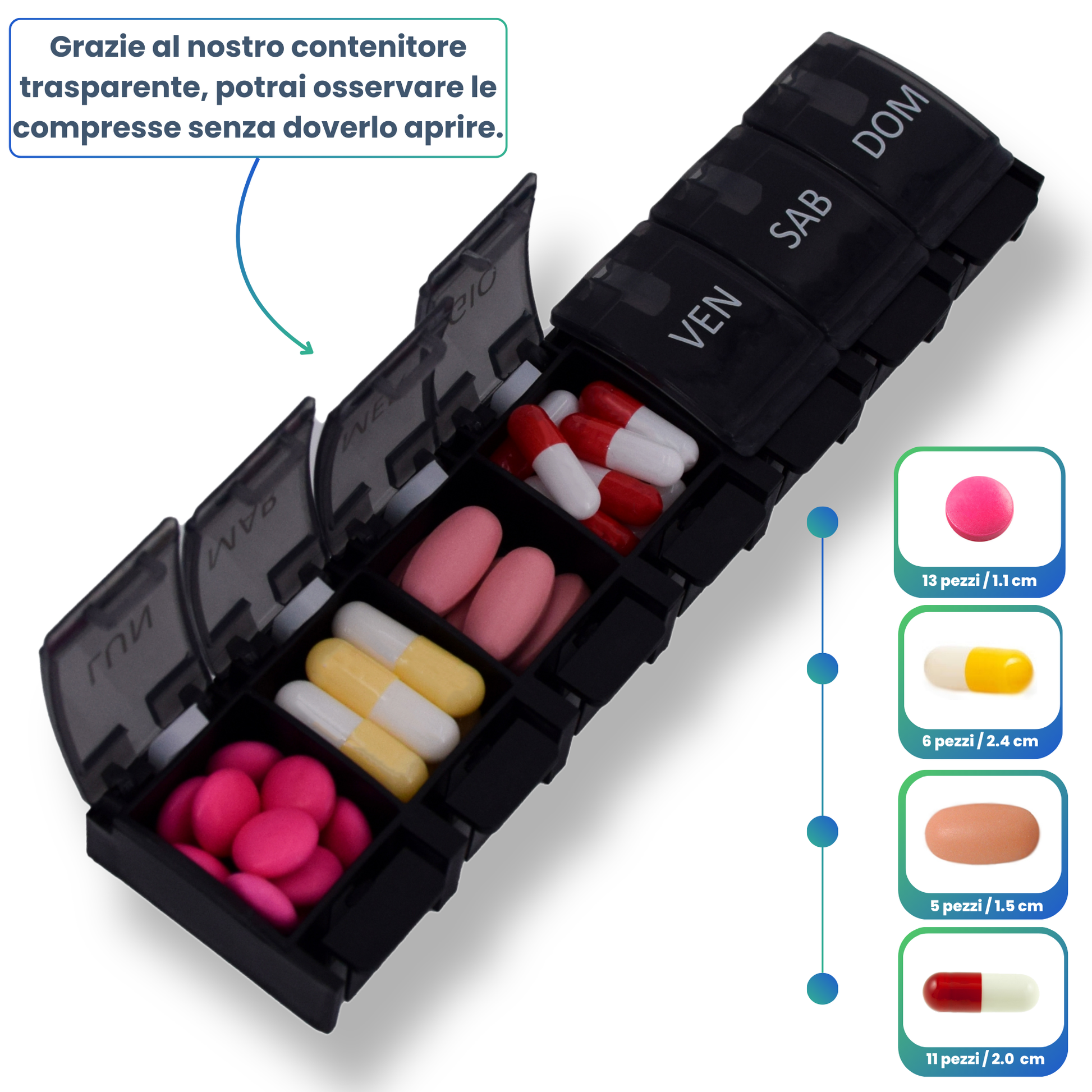 - đ ACCĂS FACILE : Compartiments spacieux et faciles Ă ouvrir Ă l'aide de boutons poussoirs, garantissant une gestion prĂ©cise et sĂ©curisĂ©e de vos mĂ©dicaments quotidiens.