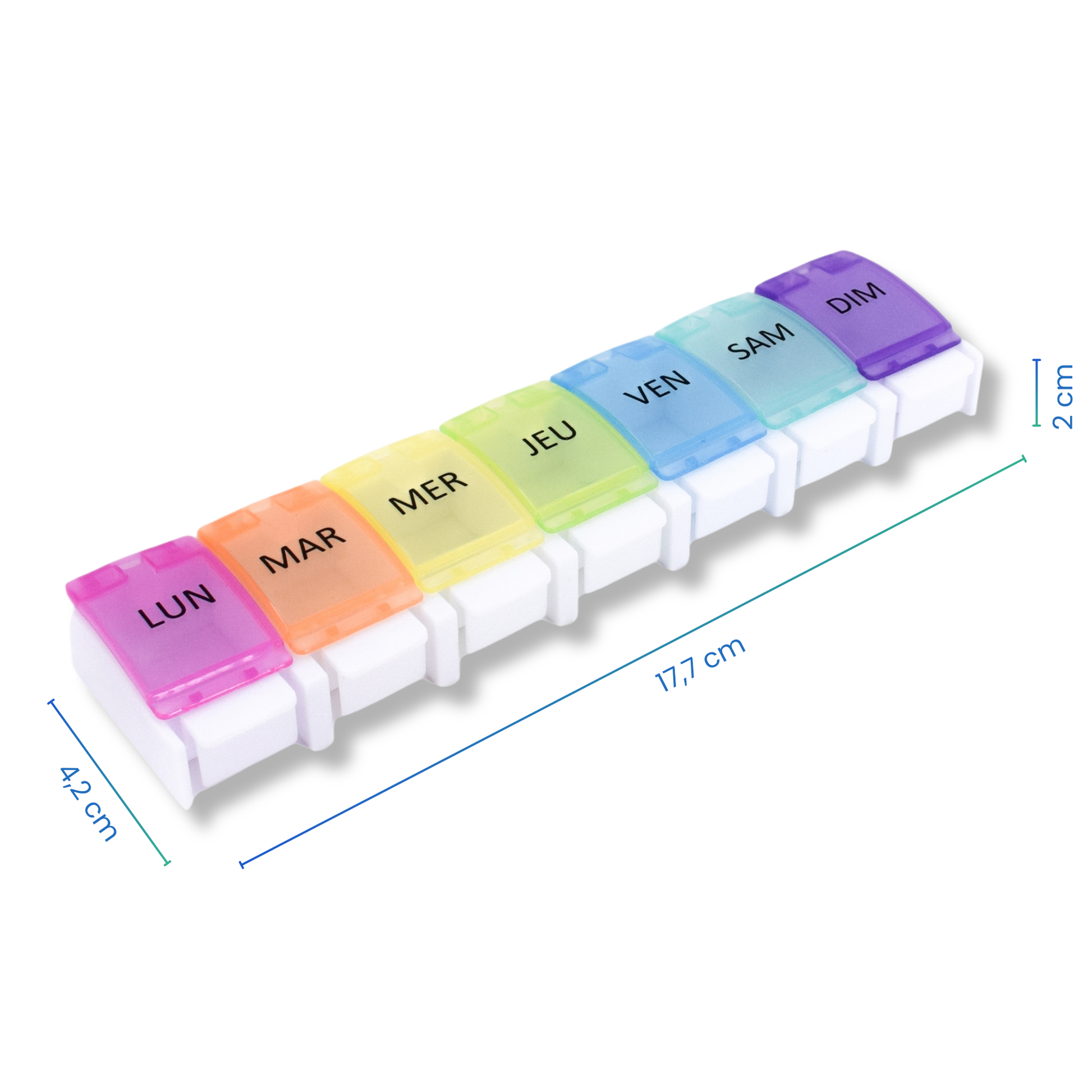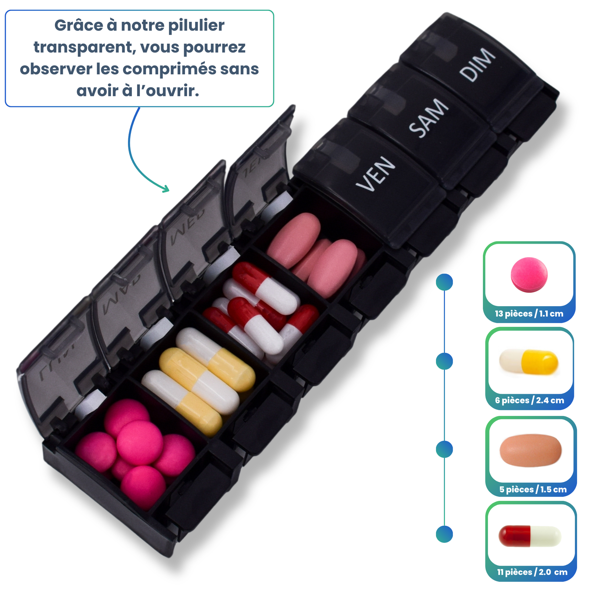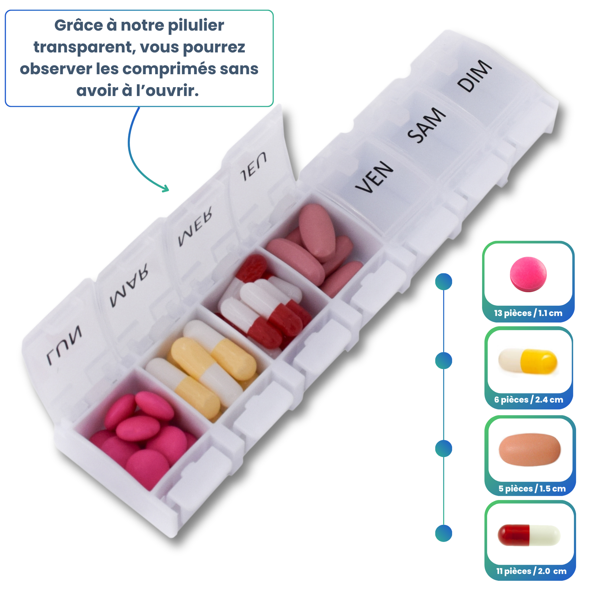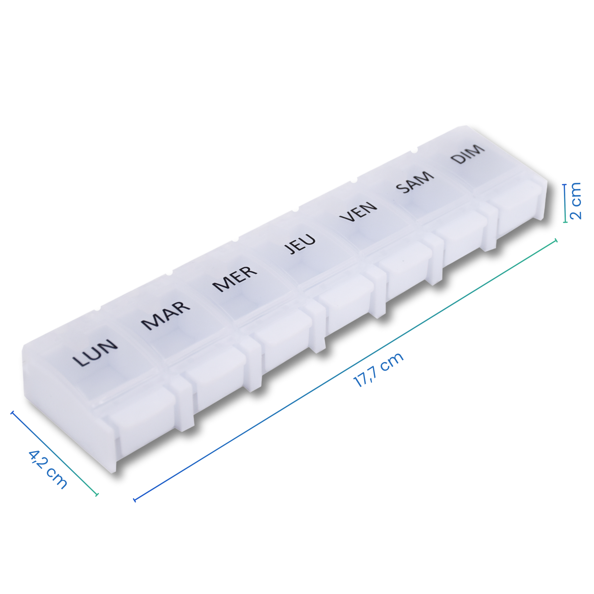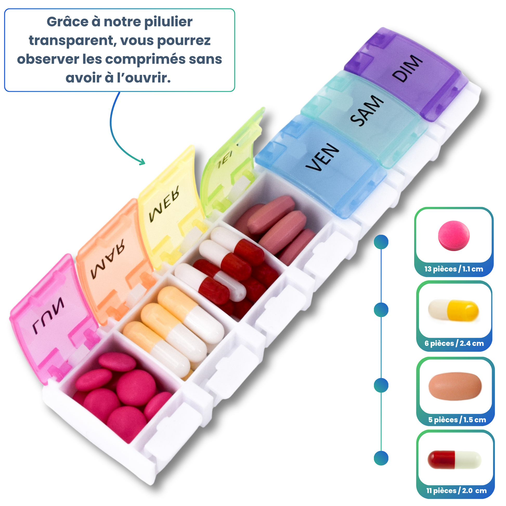 🗓️ ORGANISATION HEBDOMADAIRE : Pilulier semainier avec 7 compartiments individuels, un pour chaque jour de la semaine. Idéal pour planifier vos médicaments sur une semaine complète.