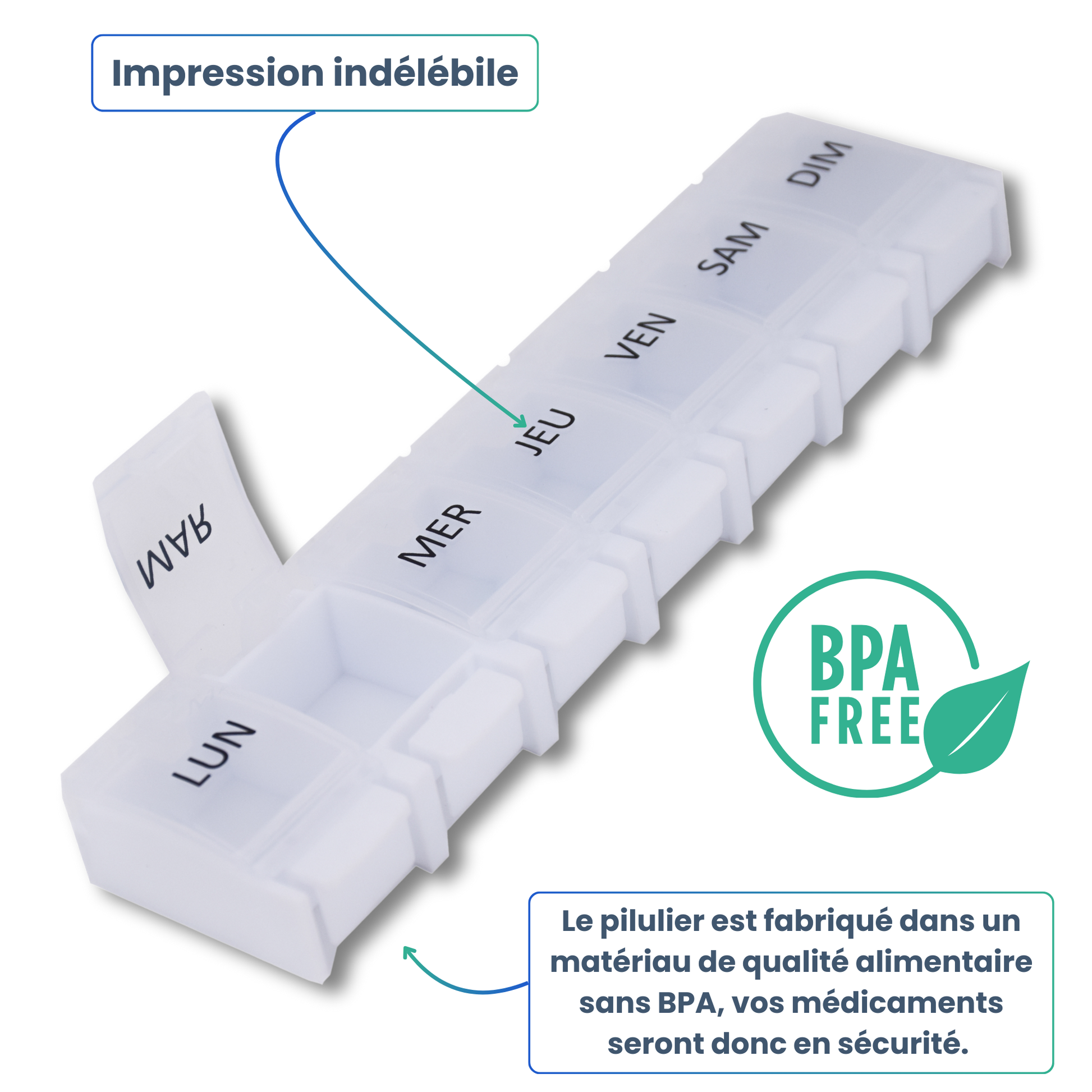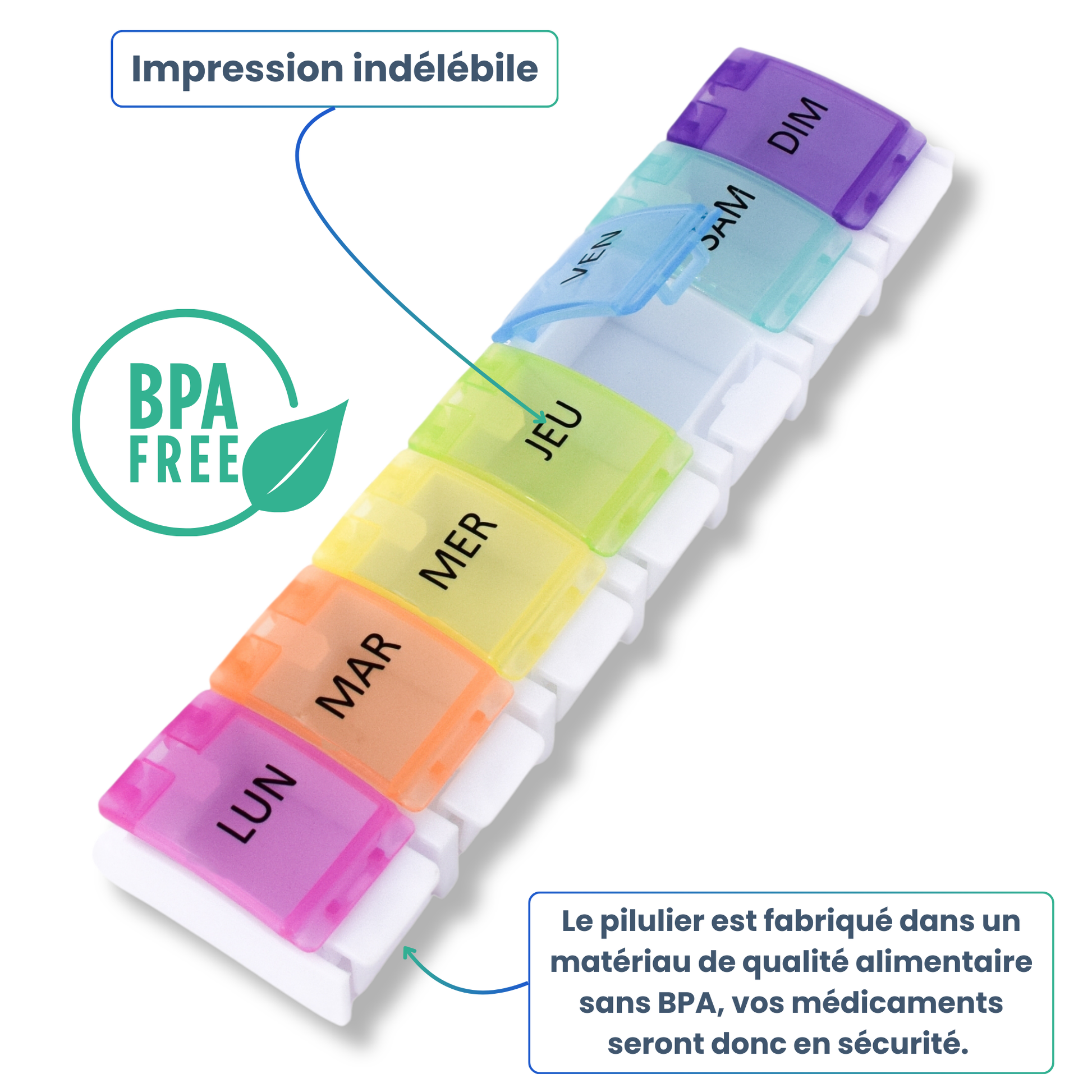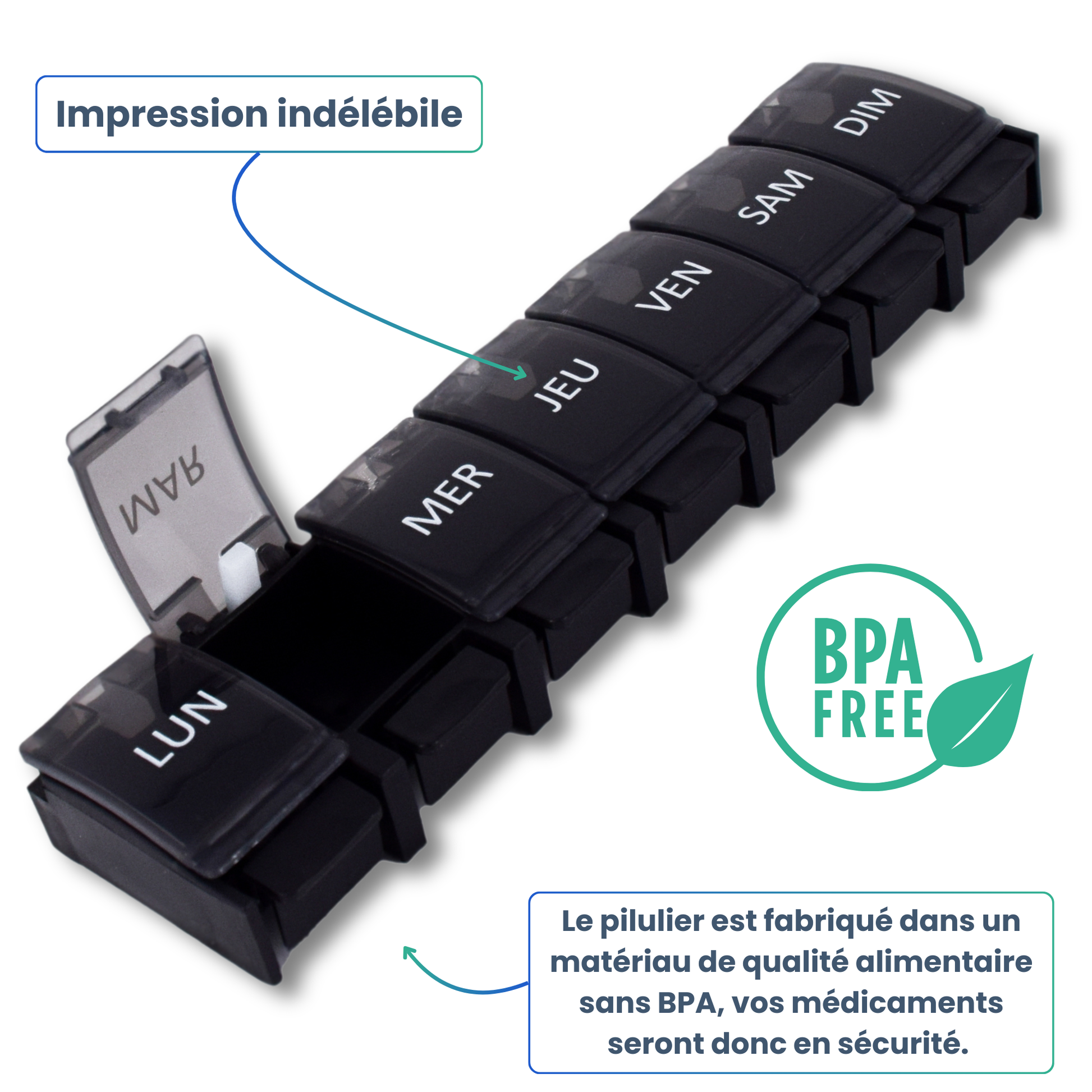 - 🛡️ DURABILITÉ : Fabriqué en plastique sans PBA robuste et durable, assurant une conservation sûre de vos pilules sans risque de contamination. Les inscriptions des jours de la semaine restent lisibles avec le temps.