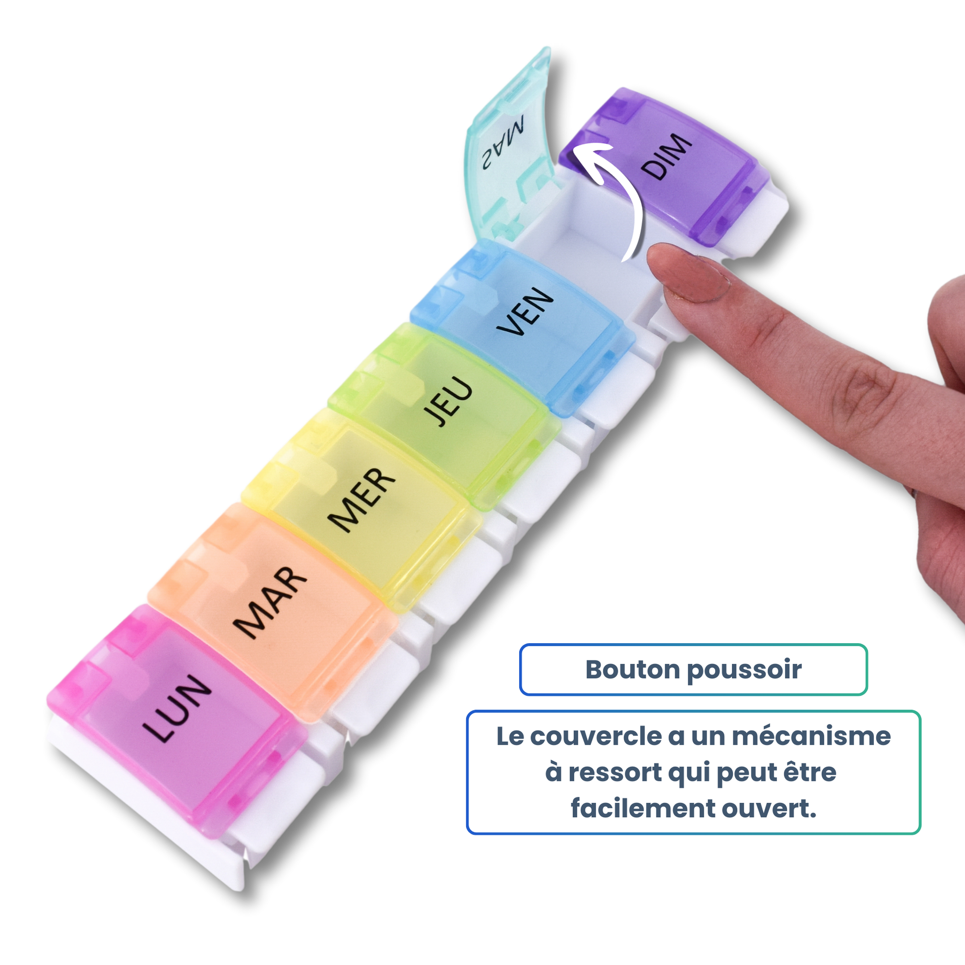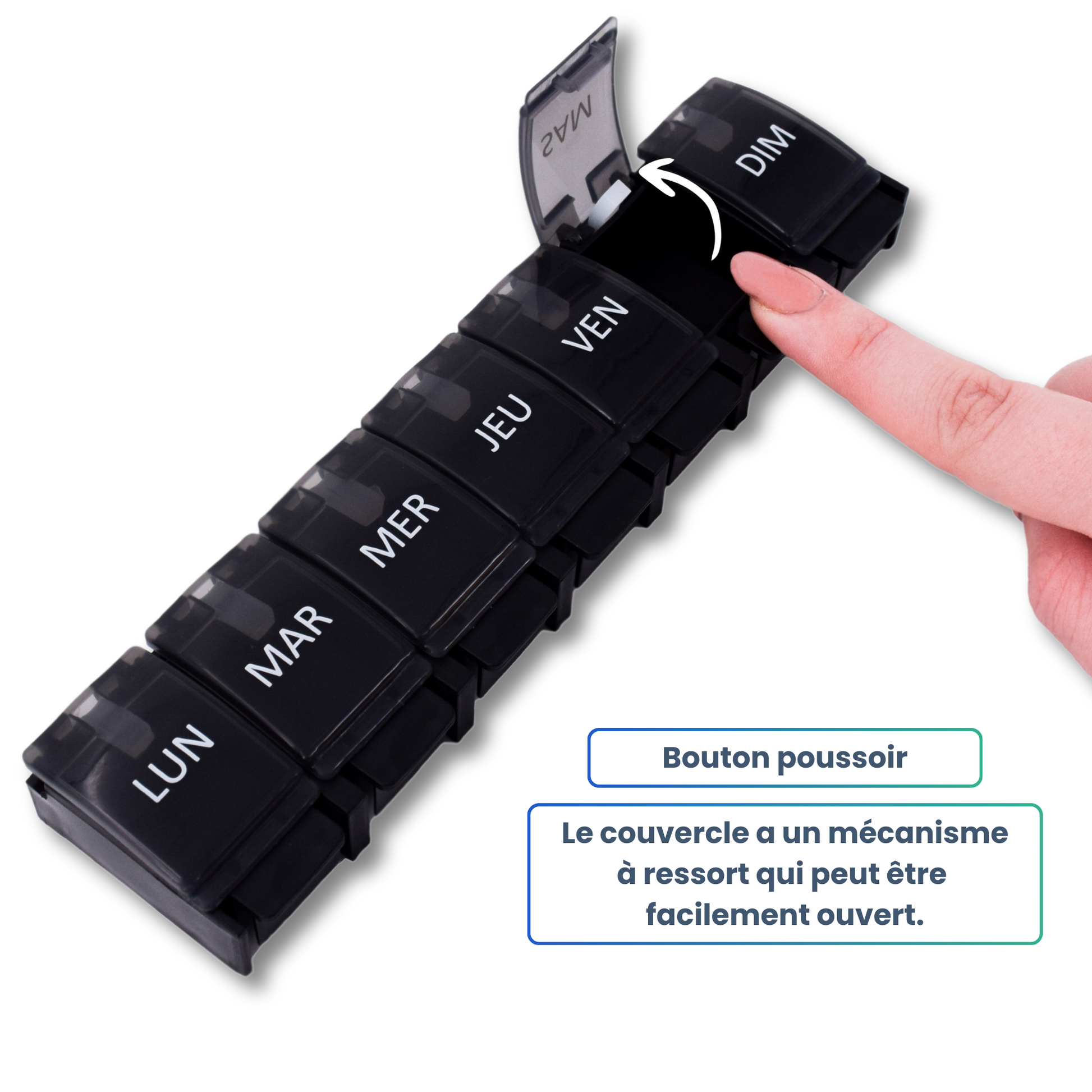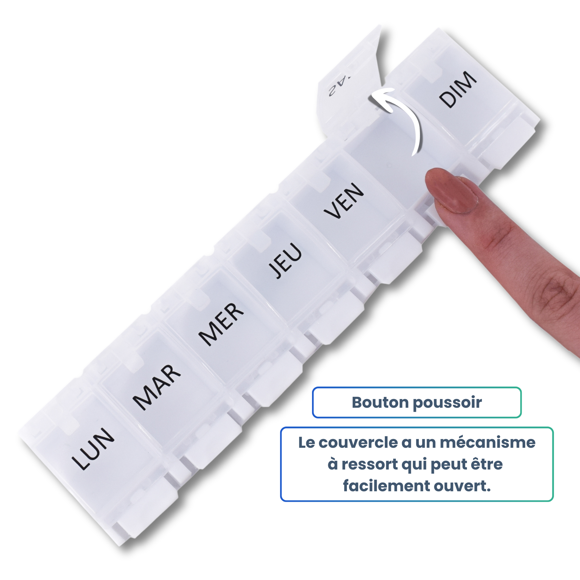 - 🔓 ACCÈS FACILE : Compartiments spacieux et faciles à ouvrir à l'aide de boutons poussoirs, garantissant une gestion précise et sécurisée de vos médicaments quotidiens.