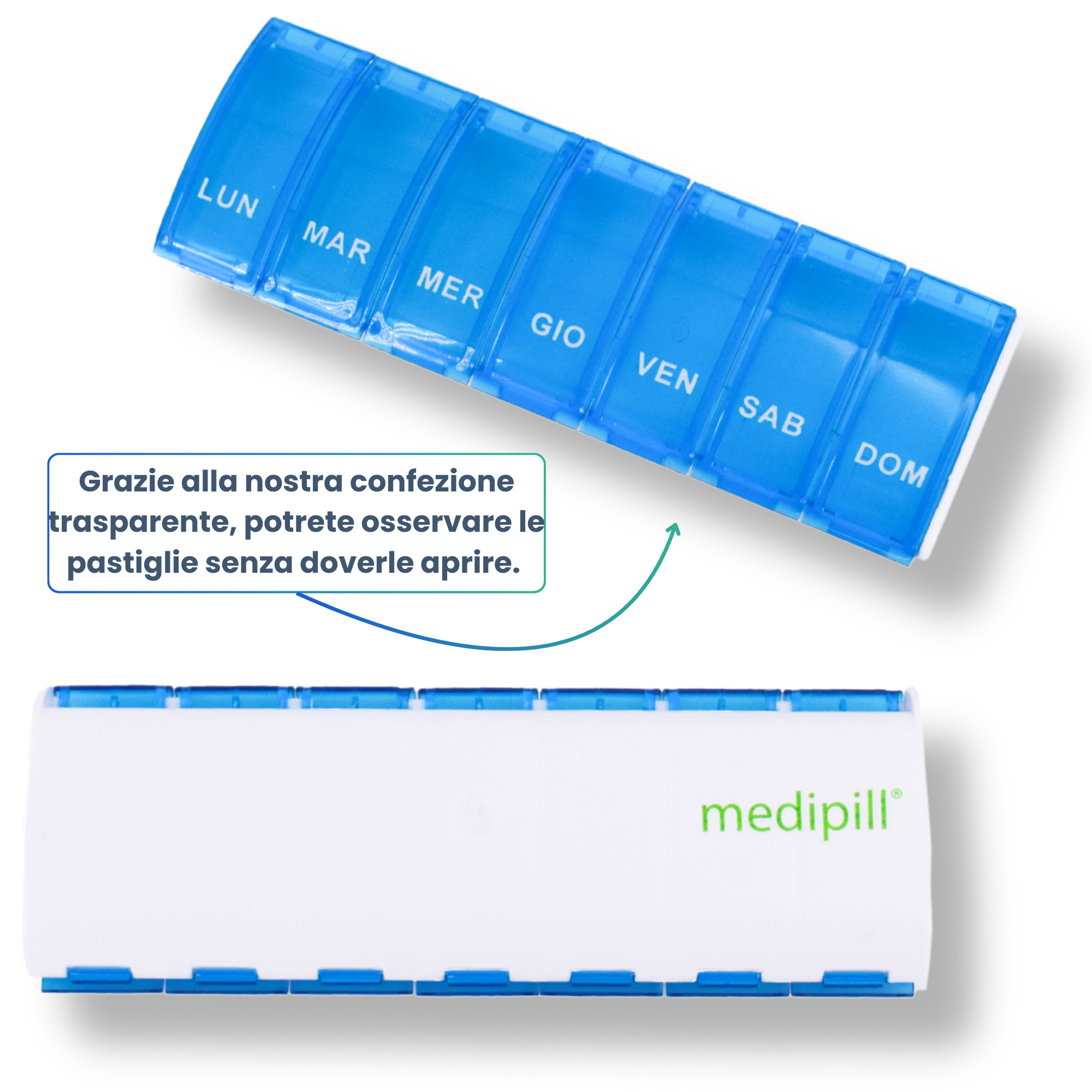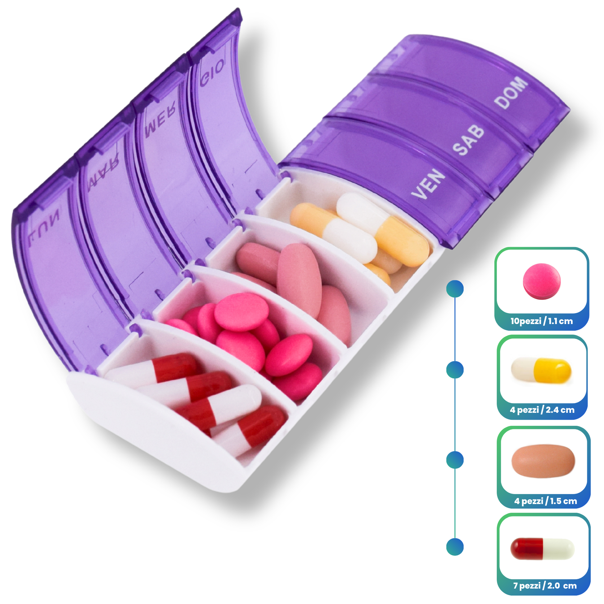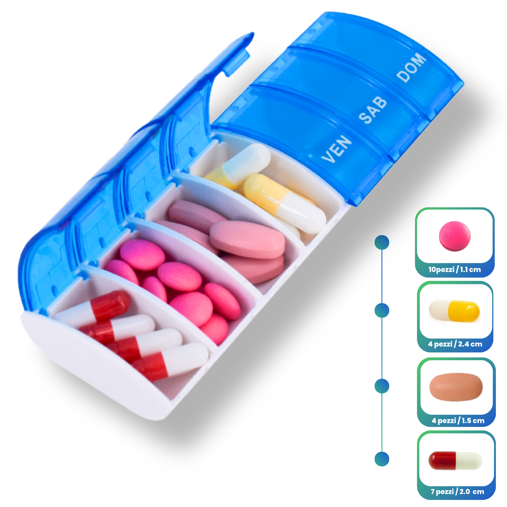 - đïž ORGANISATION HEBDOMADAIRE : Pilulier semainier avec 7 compartiments individuels, un pour chaque jour de la semaine. IdĂ©al pour planifier vos mĂ©dicaments sur une semaine complĂšte.