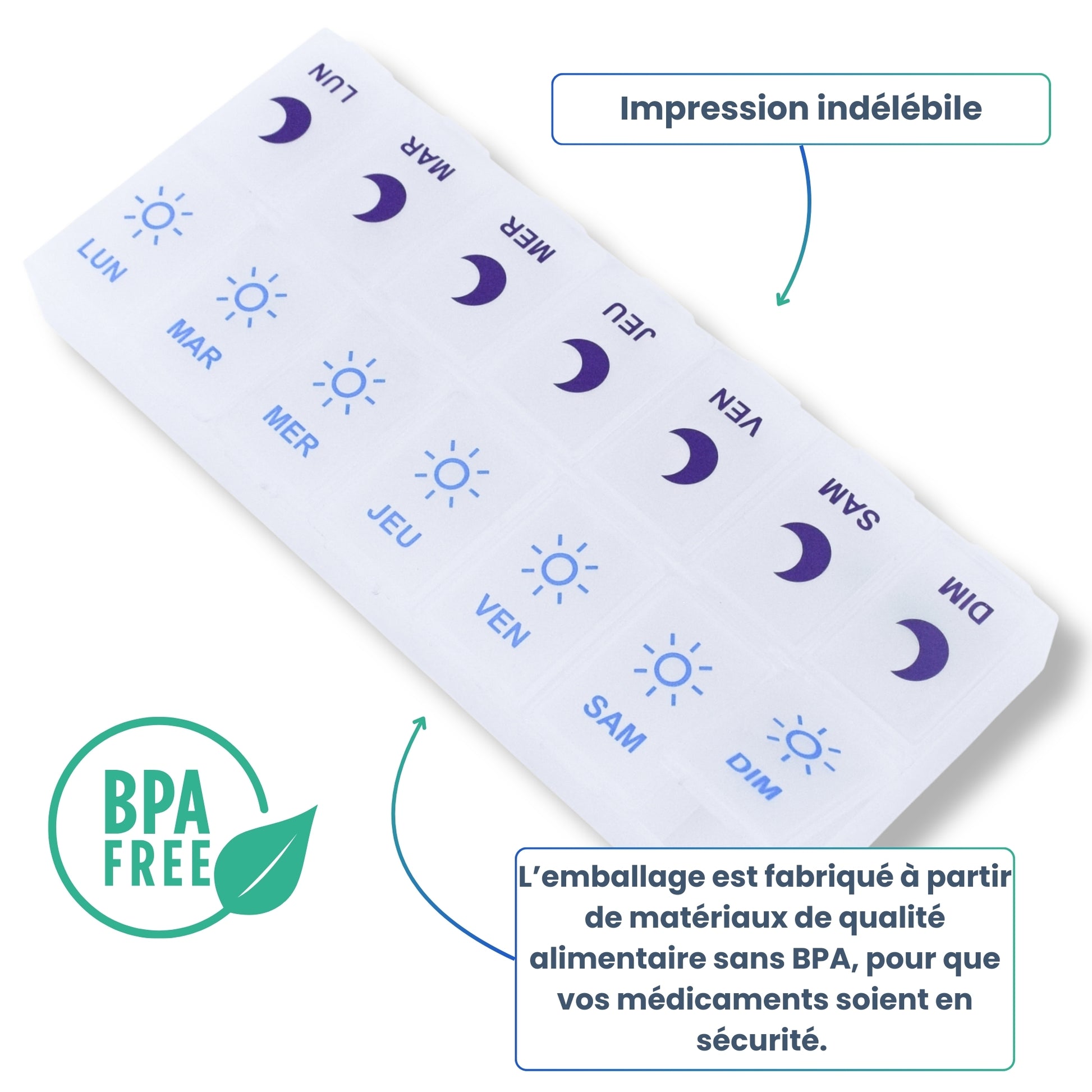 - 💪 DURABILITÉ : Boîte à médicaments robuste et durable, conçue pour résister à une utilisation quotidienne. Les inscriptions des jours de la semaine ne s'effacent pas avec le temps.