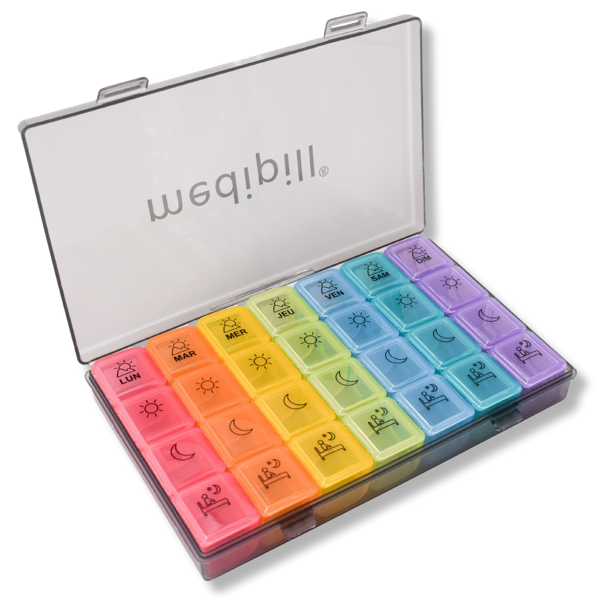- 🗓️ ORGANISATION HEBDOMADAIRE : Pilulier semainier avec 7 barrettes, chacune divisée en 4 compartiments pour matin, midi, soir et coucher. Idéal pour planifier vos médicaments sur une semaine complète.