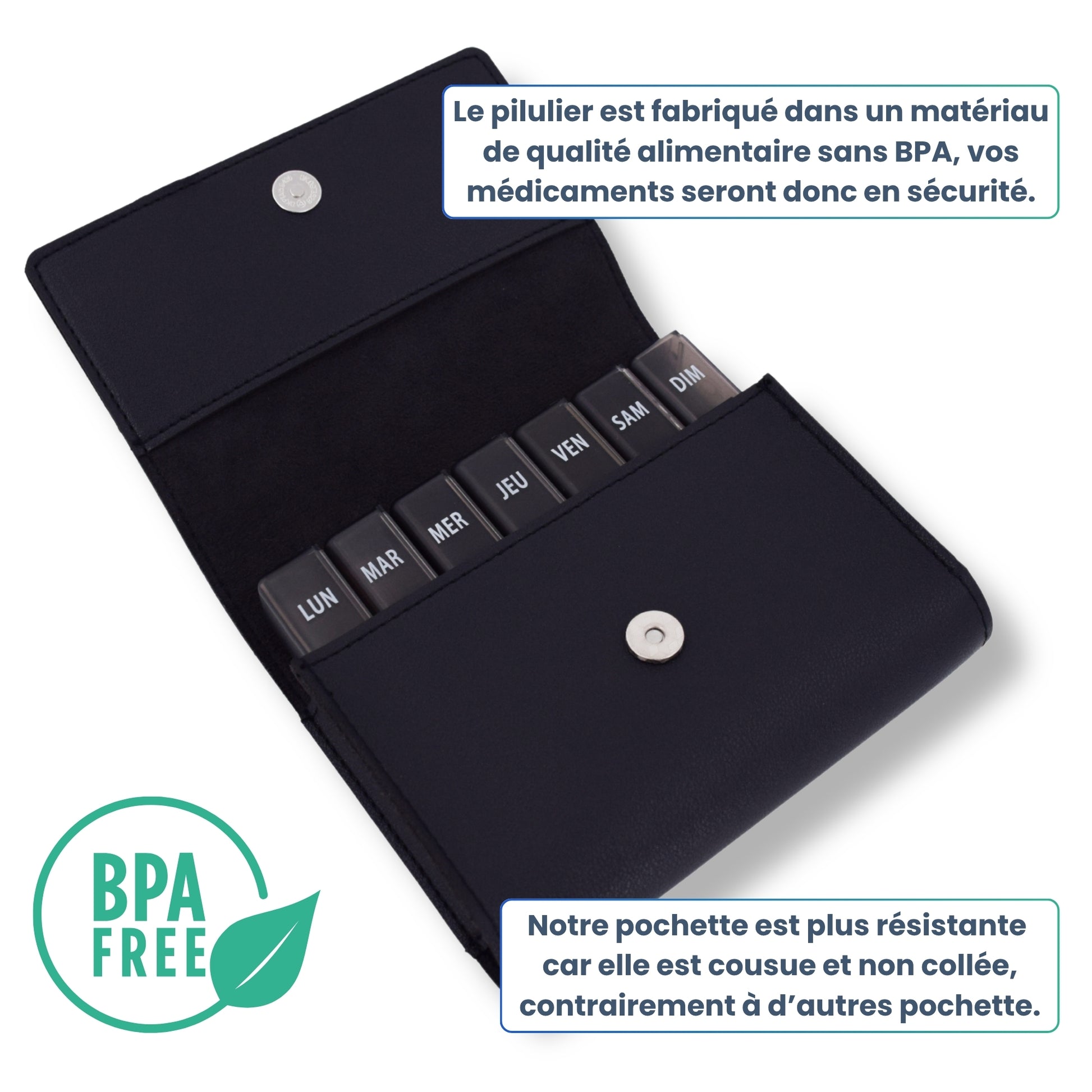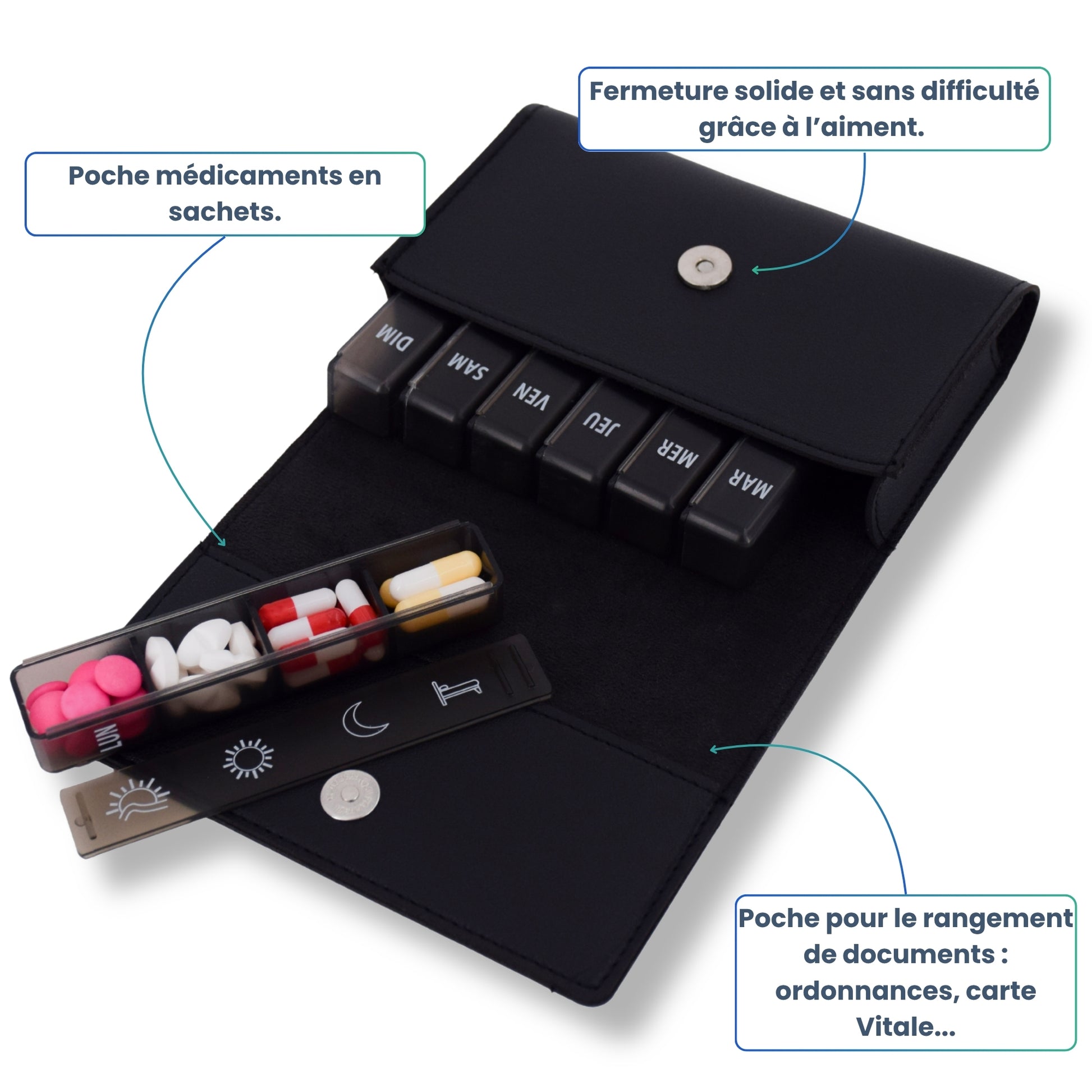 - 💼 PORTABLE ET PRATIQUE : Sacoche incluse avec fermeture aimantée, idéale pour emporter vos barrettes de médicaments lors de vos déplacements. Les barrettes se glissent facilement dans un sac à main, une valise ou une poche.